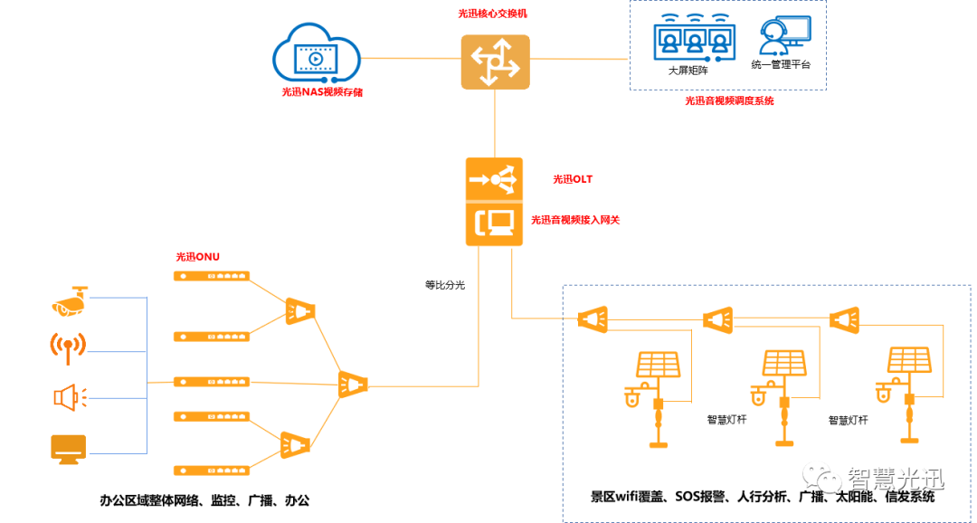 4、光纖傳輸?shù)矫恳粋€智慧燈桿,同時傳輸六種業(yè)務。