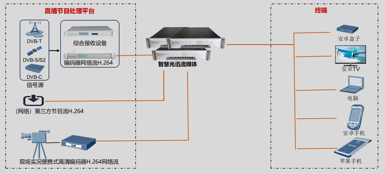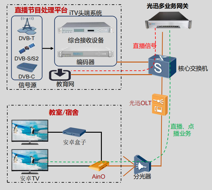 1、采用智慧光迅多業(yè)務(wù)綜合網(wǎng)關(guān)系統(tǒng)對(duì)IPTV信號(hào)處理,提供教學(xué)視頻直播/點(diǎn)播