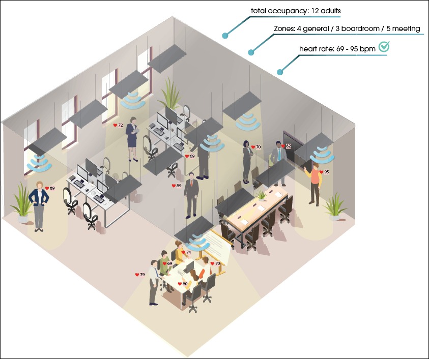 與天花板照明位于同一位置的 60 GHz RF 傳感器提供有關(guān)空間使用情況和居住者生命體征的數(shù)據(jù)。