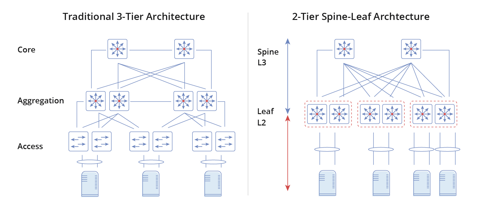 數(shù)據(jù)中心計算規(guī)模和東西向流量不斷擴大,數(shù)據(jù)中心網(wǎng)絡(luò)架構(gòu)也在不斷變化。在傳統(tǒng)的三層拓?fù)浣Y(jié)構(gòu)中,服務(wù)器之間的數(shù)據(jù)交換需要經(jīng)過接入交換機、匯聚交換機和核心交換機。這給匯聚交換機和核心交換機帶來了巨大的工作壓力。